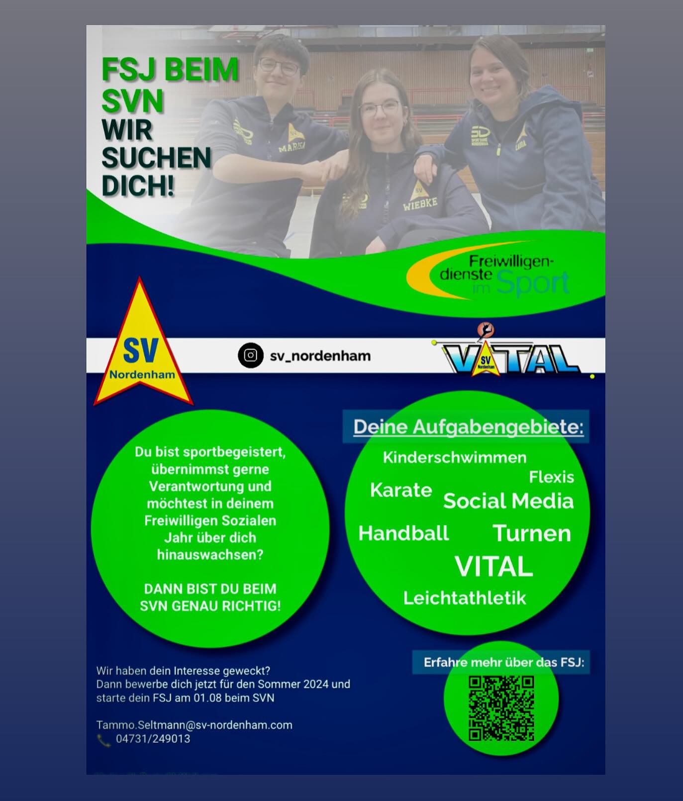 Weitere Infos über das FSJ und über den SVN findest du unter: https://www.sv-nordenham.de/de/freiwilliges-soziales-jahr/